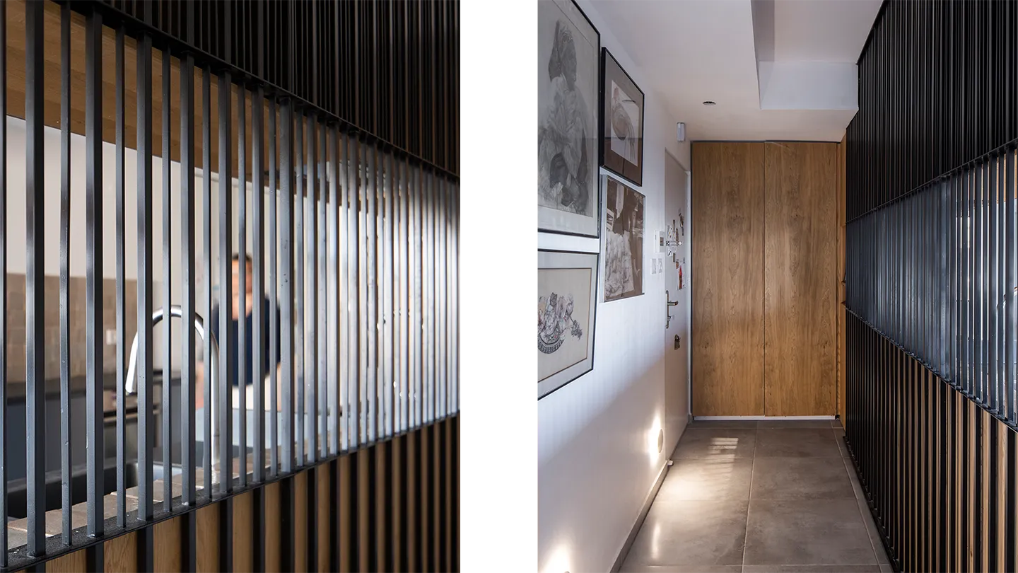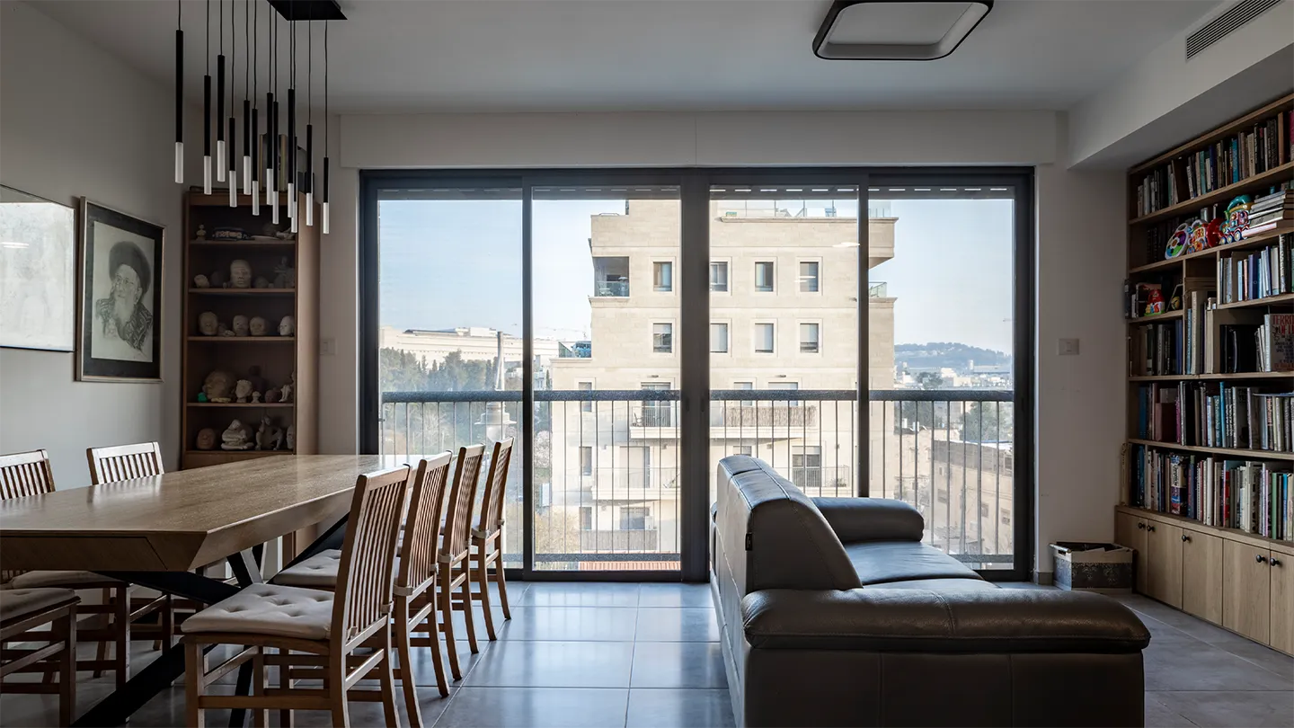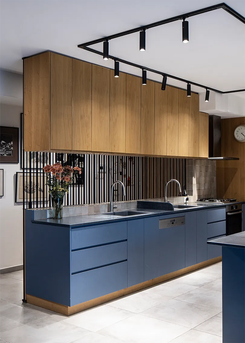 This project involved the consolidation of two apartments into a single, spacious residence spanning approximately 130 sqm. The consolidation of the apartments necessitated an expansion of the apartment's public living space and the creation of a new kitchen designed to also serve as a corridor leading into the bedroom wing. To maintain the continuity of the kitchen's counter surfaces, an entrance hallway was designed. In one of the restrooms, which shares a wall with the kitchen, a light box was installed. This feature serves as a substitute for natural light within the restroom and simultaneously acts as an artistic display—a photograph printed on glass—visible from the kitchen side.